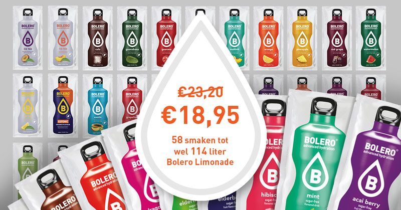 Order a mixed package of Bolero Drinks with all the 58 flavours*(of 1,5 liters) of Bolero. For 26 cent/liter delivered. Order along with your family,friends,colleagues and save even more on your cost and shipping.